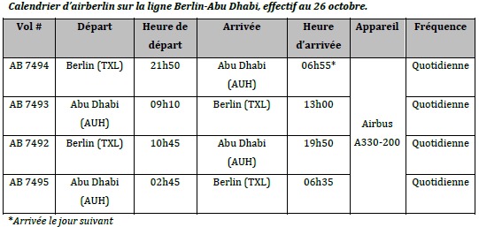 Ci-dessous, le programme du transporteur berlinois sur la ligne Berlin-Abu Dhabi à partir du 26 octobre 2014 :
