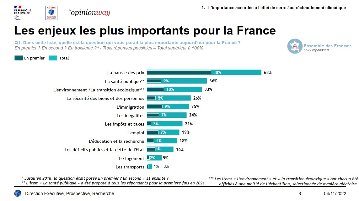 Et en effet, si la hausse des prix est le premier sujet de préoccupation des Français, le deuxième est bien celui de la transition écologique avec 10 % des sondés, qui en font la question la plus importante aujourd'hui pour la France.