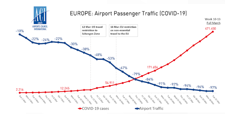 Baisse du trafic aérien en Europe corrélée à la propagation du coronavirus (en nombre de cas confirmés).