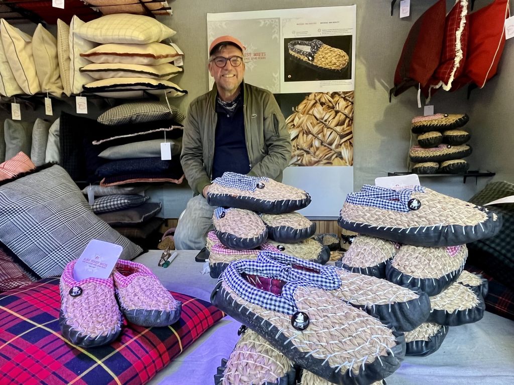 Comme ce "Christkindlmarkt" cultive les traditions, on y trouve aussi des spécialités locales (jambon, fromage, saucisses, gâteaux) ainsi que des produits artisanaux de la Forêt-Noire. Par exemple les solides chaussons fourrés en paille de blé tressée, renforcés par une semelle de caoutchouc recyclé, vendus par Leif Karpe.