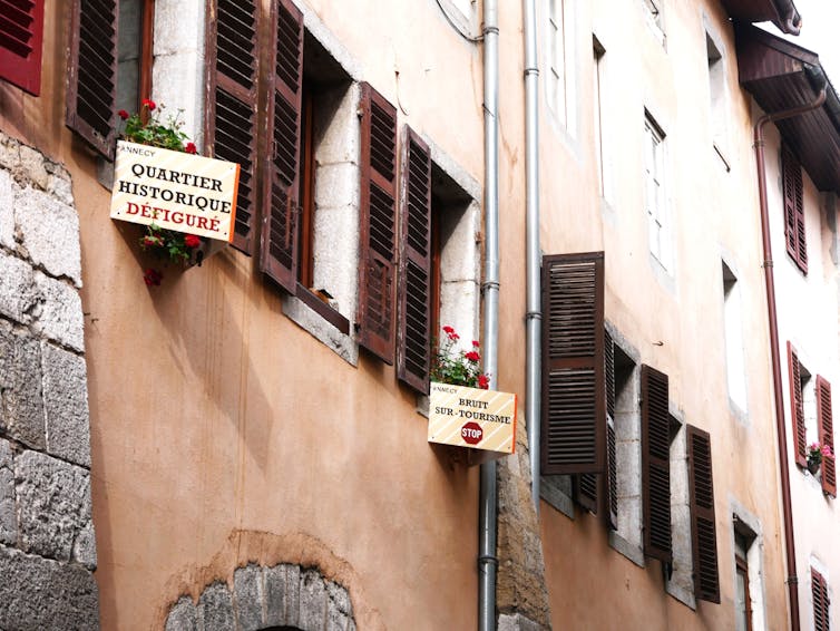 Le surtourisme est un problème global qui touche de nombreux pays et pour lequel chaque destination apporte des réponses différentes. Quand les autorités publiques réagissent peu, comme à Annecy, les résidents s’unissent pour exprimer leur mécontentement. Les adhérents de l’Association des résidents de la vieille ville d’Annecy (ARVVA) ont pris le problème à bras-le-corps en organisant des mobilisations citoyennes et en affichant des messages de sensibilisation à destination des touristes.