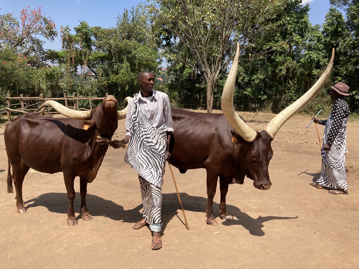 Vaches sacrées aux cornes impressionnantes, dans l’ancien palais royal rwandais, à Nyanza, au sud de Kigali. - Photo JFR