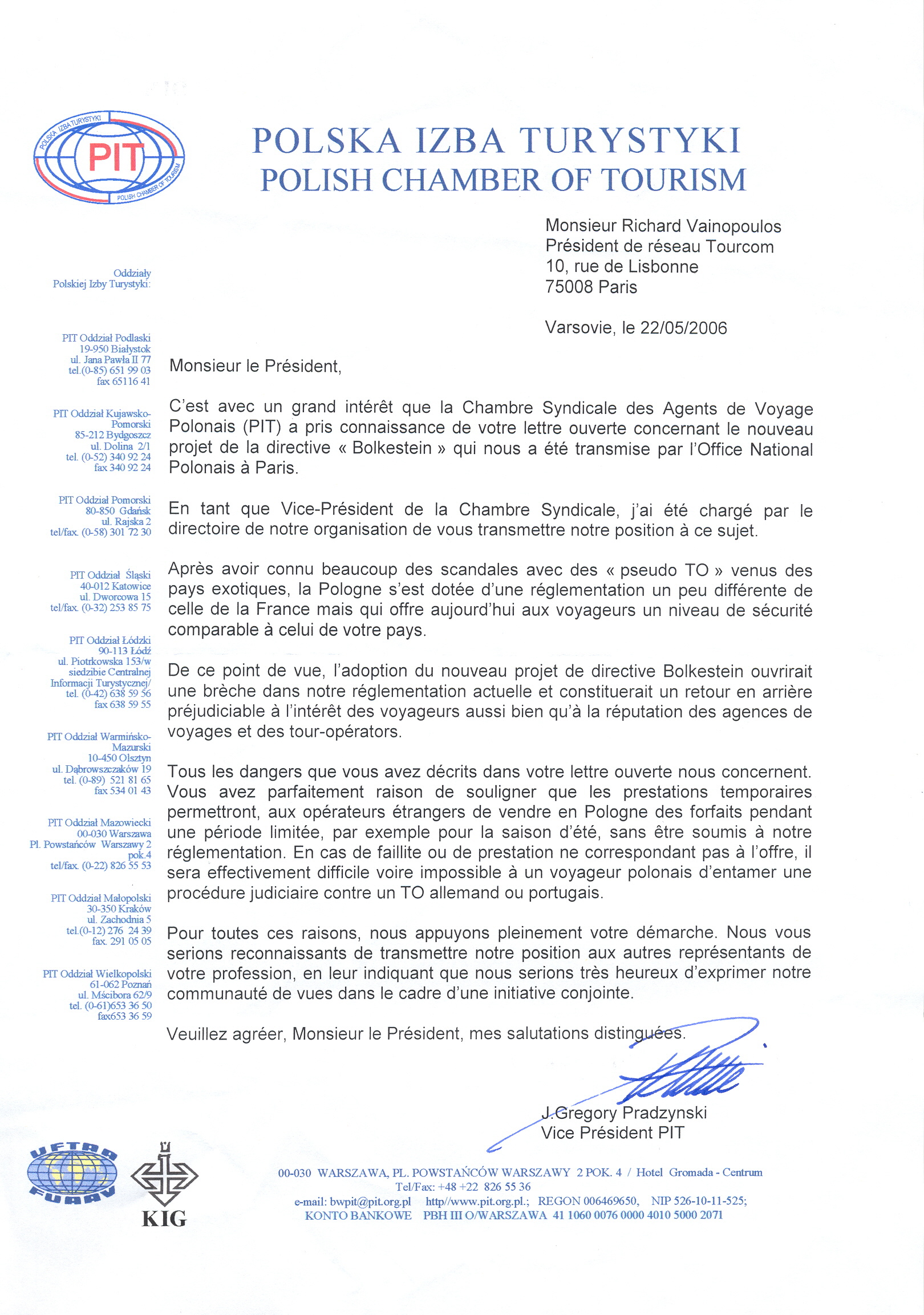 Bolkestein : les agences de voyage polonaises soutiennent TourComle syndicat polonais écrit à R. VainopoulosQui l'eut crû ? Le pays du "plombier polonais" est, lui aussi, soucieux de préserver les droits des consommateurs et veut éviter que des "pseudo TO" ne nuisent à l'ensemble de la profession. Le PIT, homologue du Snav français, a écrit à Richerd Vainopoulos pour le soutenir dans son combat contre la Directive Bolkestein. Lire le courier en pièce attachée.Rédigé par Jean DA LUZ le Mercredi 7 Juin 2006