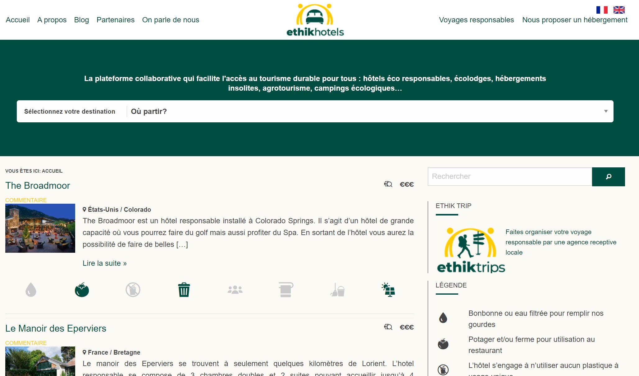 La plateforme www.ethik-hotels.com regroupe les établissements de tourisme éco-responsables (hôtels, maisons d’hôtes, camping, hôtels de luxe, lodges, cabanes perchées...) en France et à international.