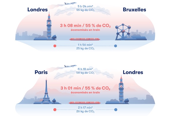En haut du classement se trouve Londres-Bruxelles avec un gain de temps de 3h13, pour 30kg de CO2 économisé, devant Paris-Londres (3h00 et 32kg), puis Rennes-Paris (2h48 et 28kg).