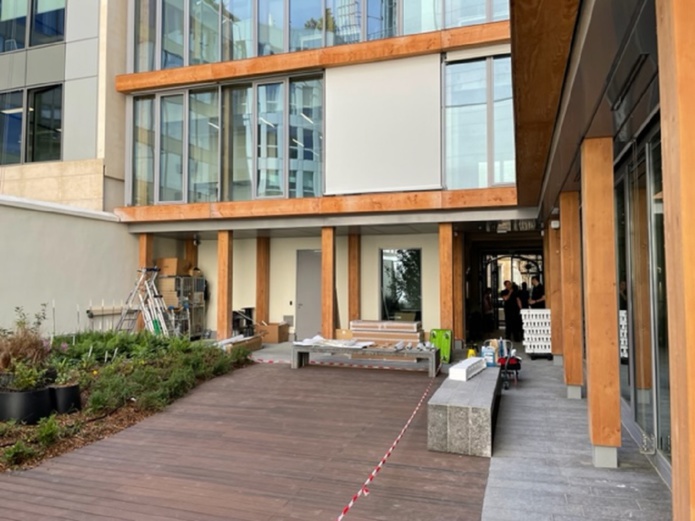 Belle entrée en pierre de taille avec élégantes portes fenêtres, Patio de verdure et de bois précieux, voici quelques photos exclusives de l’immeuble Air France – KLM.