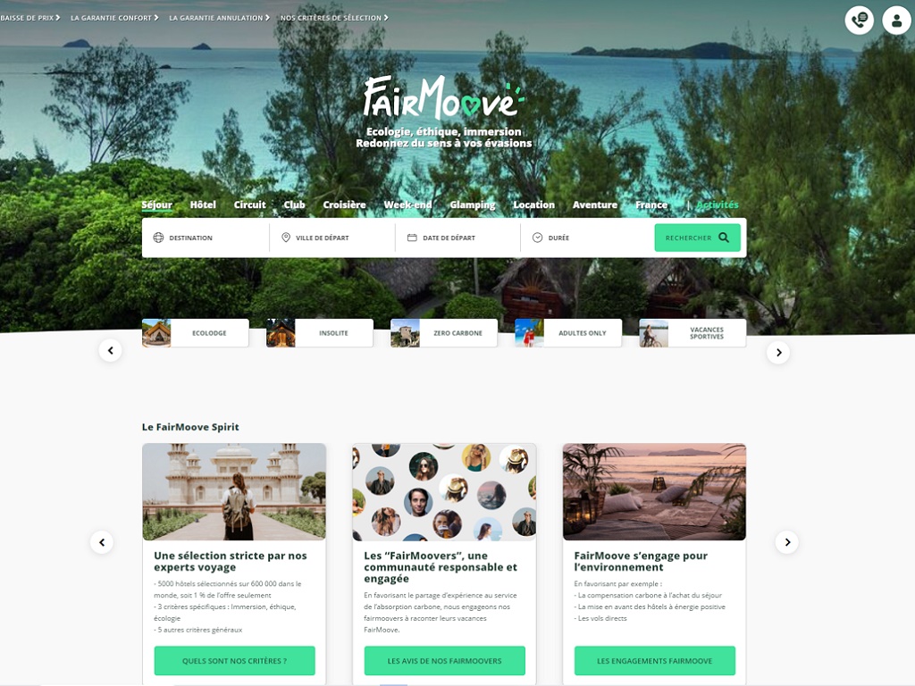Ainsi, FairMoove propose une sélection de produits, dont 5000 hôtels sur les 650 000 que compte le globe, basée sur les critères d'actualité pour les voyageurs d'aujourd'hui.