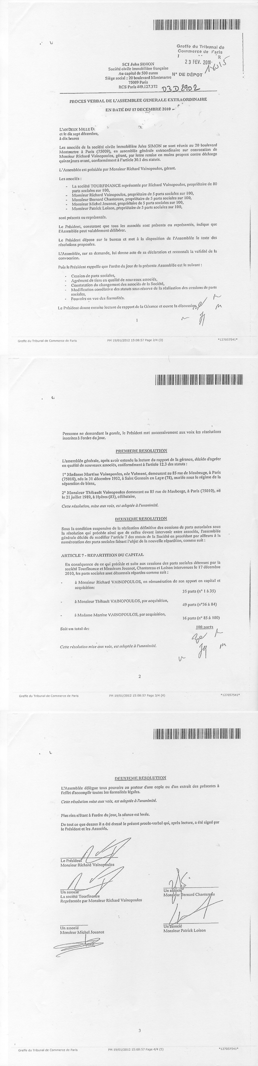 Autre question qui fâche : comment se fait-il qu'un studio de 37m², propriété de Tourfinance et situé à Boulogne Billancourt dans les beaux quartiers ait été cédé en 2010 à la famille Vainopoulos (Monsieur, Madame et Fiston) ? (cf pièce jointe)