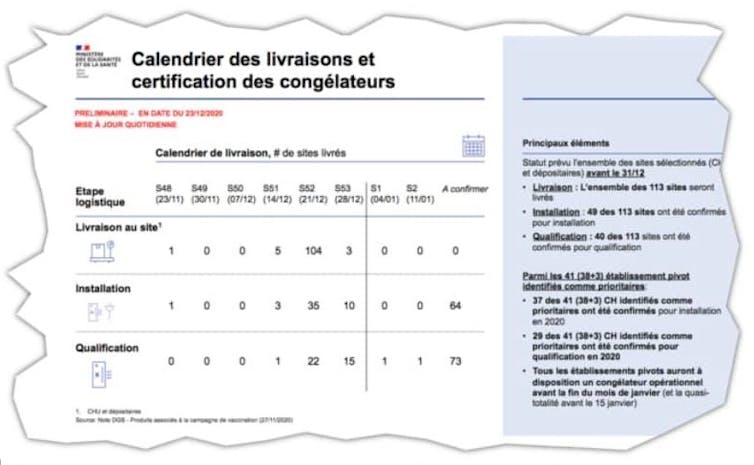 Par ailleurs, 75 % des Ehpad sont approvisionnées par une pharmacie référente. Sachant qu’il est matériellement impossible de doter ces milliers de pharmacies des fameux congélateurs, l’État choisit alors logiquement de passer par des dépositaires. Six plates-formes logistiques sont prévues pour centraliser les stocks et toucher toute la France.