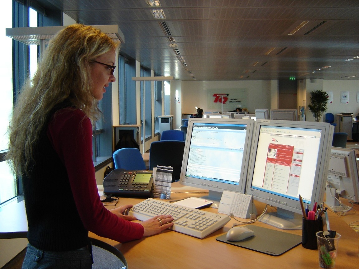 Tout aussi remarquables sont les bureaux, qui se montent et se baissent grâce à un système de commande électronique pour permettre aux consultants voyages de "pianoter" -à loisir - debout (air connu) ou assis.