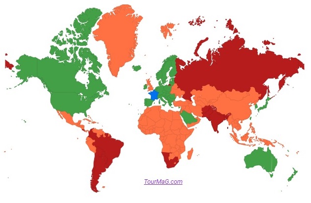 La liste des pays rouges : Afrique du Sud, Argentine, Bahreïn, Bangladesh, Bolivie, Brésil, Chili, Colombie, Costa Rica, Inde, Népal, Pakistan, Sri Lanka, Suriname, Uruguay, Paraguay, Afghanistan, Maldives, la Namibie, les Seychelles et la Russie.