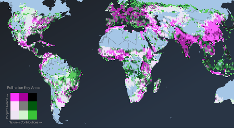 Notre équipe – du Natural Capital Project à l’Université de Stanford – a modélisé quelques-uns de ces processus pour établir une carte interactive du monde ; il s’agit de montrer la capacité – en déclin – de la nature à fournir des pollinisateurs pour nos cultures ou protéger les populations contre les tempêtes côtières et les eaux polluées.