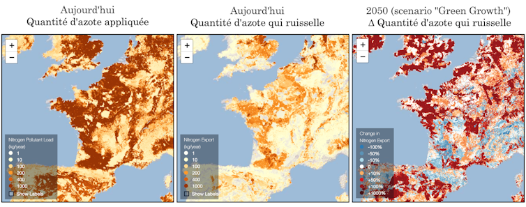 Les polluants (azote des engrais agricoles, carte de gauche) que le sol n’absorbe pas (carte du milieu) ruissellent jusqu’aux cours d’eau. Cette pollution non absorbée risque d’augmenter d’ici 2050 (carte de droite).