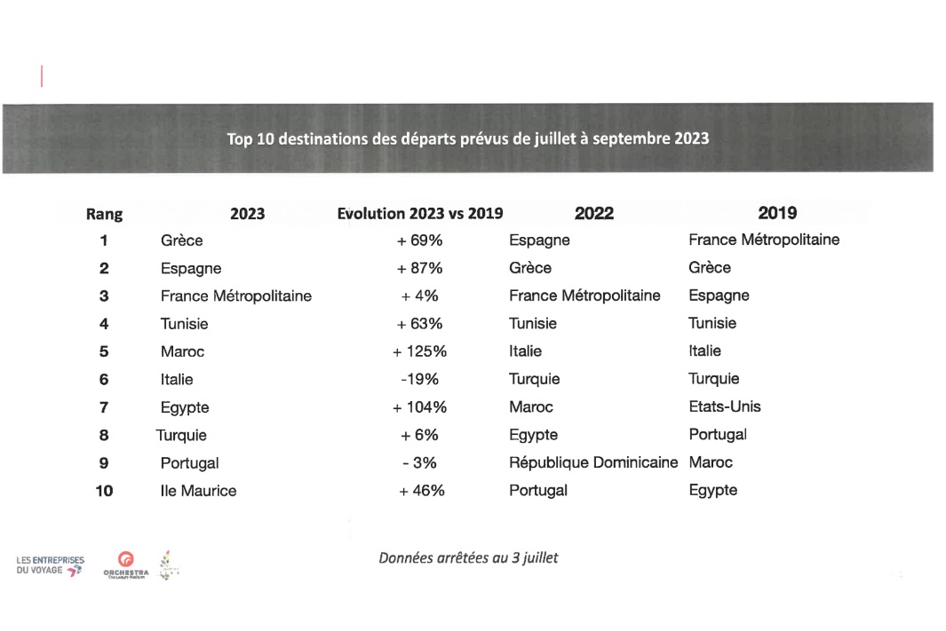 Le TOP destinations reste sans surprise : la Grèce, l’Espagne, la France métropolitaine, la Tunisie caracolent en tête avec le Maroc qui devient une destination d’été, tout comme l’Egypte.