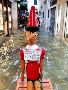 « Venise est sauvée grâce au Mose », peut-on lire sur la pancarte ironique portée par un Pinocchio, le 12 novembre 2019, en réaction à l’inefficacité du projet de digues mobiles censées protéger la ville des marées hautes.