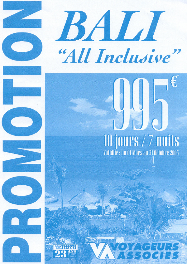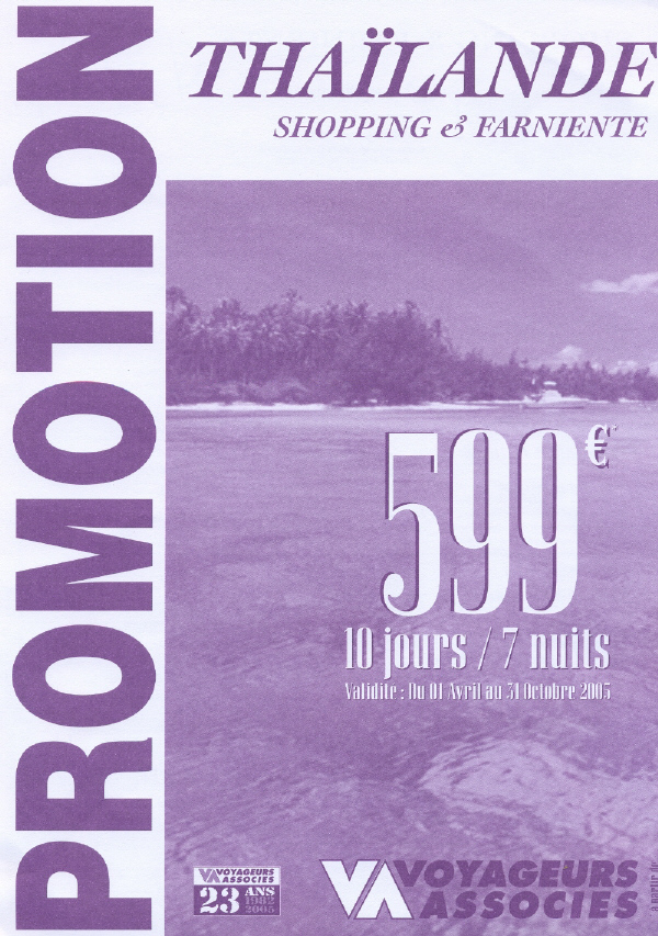 Le TO Voyageurs Associés vient de sortir 2 promos pour booster 2 destinations qui en ont besoin : la Thaïlande avec un produit à 599 euros 10 jours/7 nuits valable du 1er avril au 31 octobre 2005 et Bali en "all inclusive" à 995 euros 10 jours/7 nuits valable du 1er avril au 31 octobre 2005 valable du 1er mars au 31 octobre 2005.