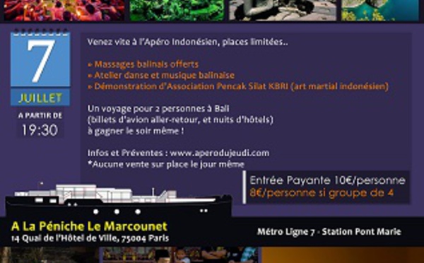 Le 7 juillet 2016, l'Office de Tourisme de l'Indonésie organise un apéro indonésien à Paris. Il donne rendez-vous aux professionnels du tourisme à la péniche Le Marcounet, 14 quai de l'Hôtel de...