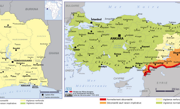 Le Quai d'Orsay met à jours les deux fiches de la Côte d'Ivoire et de la Turquie dans la rubrique "Conseils aux Voyageurs" de son site Internet après les attentats de Grand Bassam et d'Ankara de...