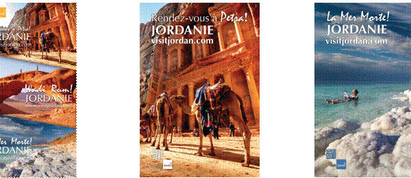 L'Office de Tourisme de Jordanie communique avec des visuels qui vantent 3 de ses sites touristiques les plus connus (Petra, Mer Morte et désert du Wadi Rum) dans le métro, les gares SNCF et RER...