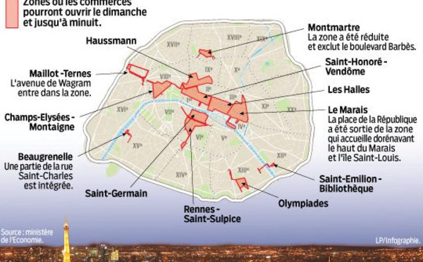 Ce jeudi 24 septembre 2015, le décret établissant les 12 zones touristiques internationales de Paris est publié au Journal Officiel. Les commerces pourront y ouvrir le soir et les dimanches. Les 12...