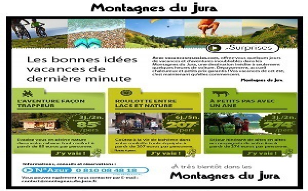 De juillet à octobre 2012, Montagnes du Jura va mener une vaste campagne de communication sur Internet afin de développer le nombre des visiteurs. La marque va investir 140 000 € TTC pour l'occasion....